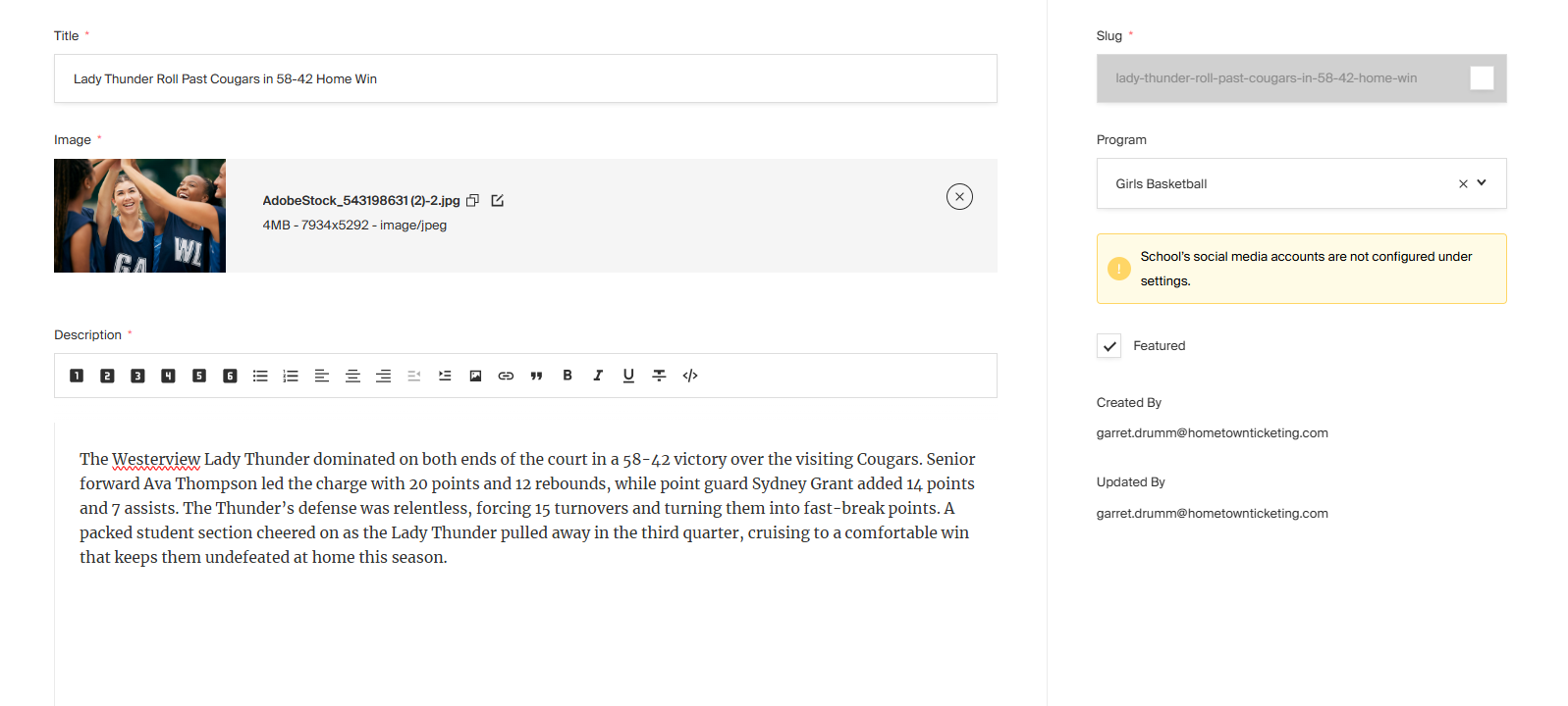 News Articles allow you to quickly communicate information to your community. Each article requires a title, image and description. Optional features include: