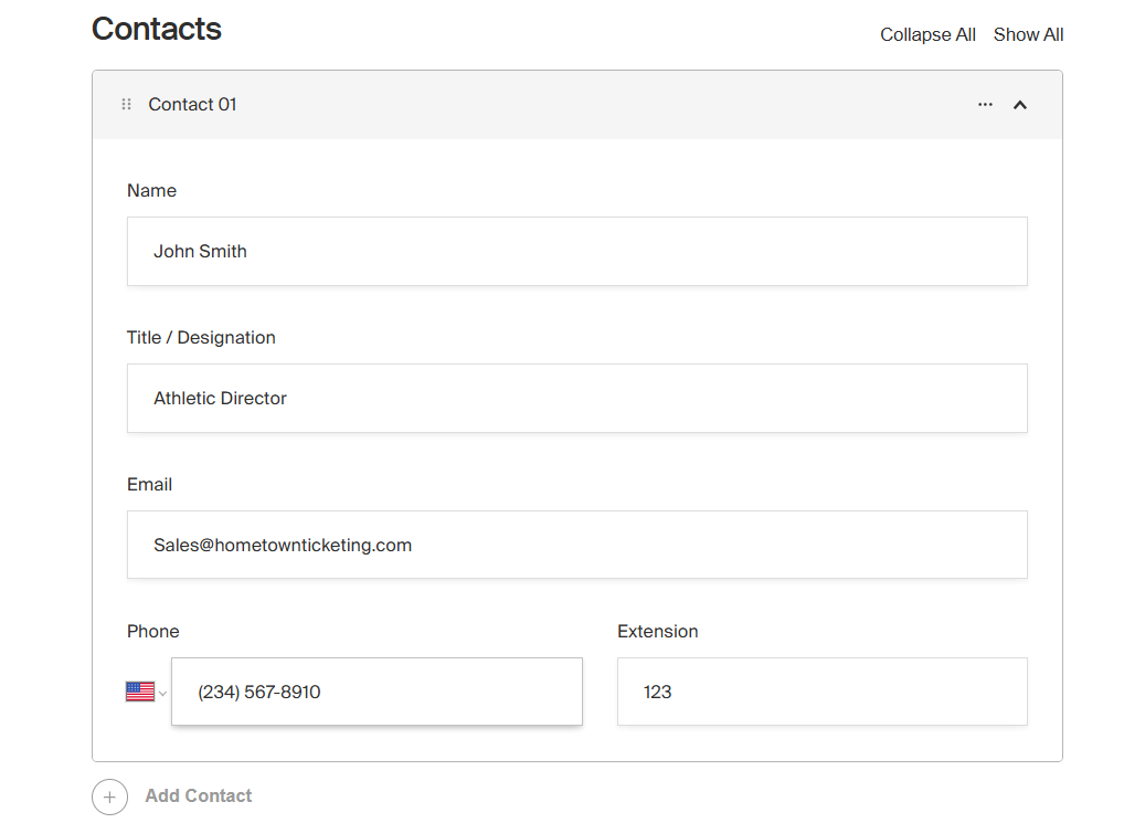 Add up to three key contacts to display on your website, each with a convenient hyperlink for their email and phone. For each contact, you can include a name, title, email address and phone number. Easily reorder the display of these contacts by dragging and dropping them into your preferred sequence.