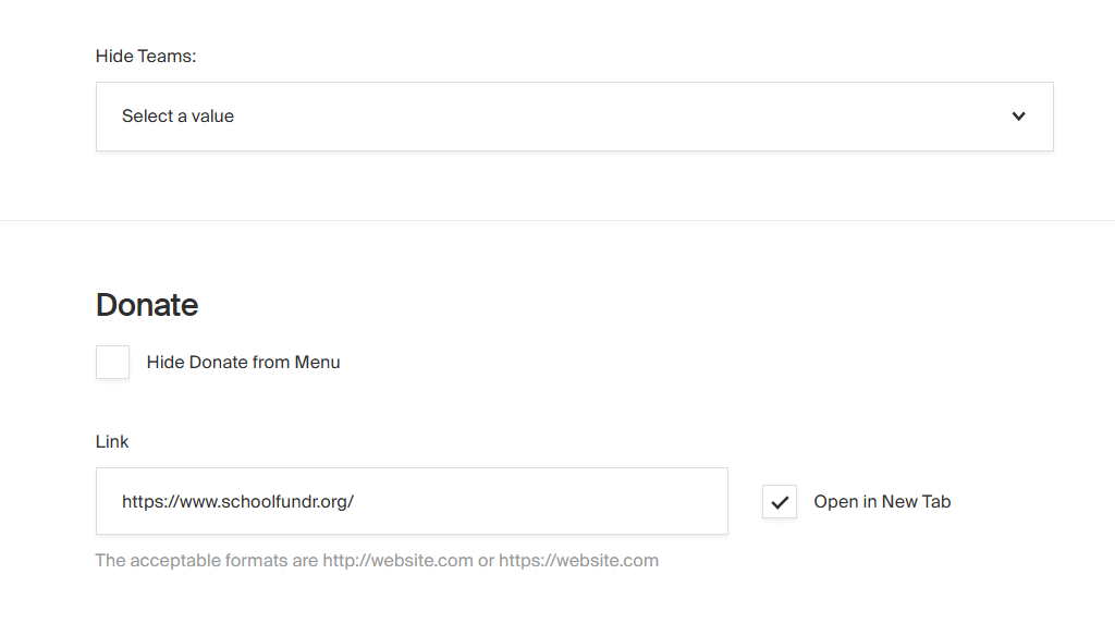 Hiding Teams: By default, all teams associated with the school in the Box Office will appear in the website’s teams dropdown menu, organized by gender. Use this section to select specific teams that you do not want to be displayed on your website.